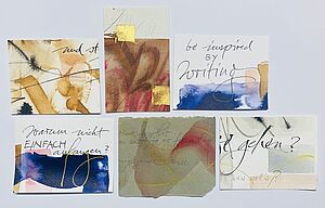 Bitte mitbringen: alles, was ihr schon an Schreibmaterial habt verschiedene Papiere A4 und größer: Papiere mit Struktur wie z. B. Aquarellpapier - Flüssigkeiten und Werkzeuge reagieren auf jedem Untergrund anders Papiergewicht ab 160 g (etwas wie Visitenkarten), wenn ihr die kleinen Formate wie Kärtchen sammeln wollt. Kleine weiße Wachskerze oder ein Stück Wachs, Bleistifte, Lineal, Farb- oder Aquarellstifte