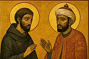 Mitten in der Zeit der Kreuzzüge reist Franz von Assisi 1219 zum ägyptischen Sultan al-Kamil und wird dort wohlwollend aufgenommen. Die beiden Männer begegnen einander auf Augenhöhe. Die gemeinsame Sehnsucht nach Frieden und die Erkenntnis, dass beide Religionen dem Wohl aller verpflichtet sind, überwiegt jeglichen Missionseifer. Auch wenn ihre Hoffnung auf Frieden nicht sofort erfüllt wurden, entsteht aus ihrer Begegnung gegenseitige Wertschätzung. In Franziskus' Spiritualität können wir muslimische Impulse entdecken wie z.B. den Lobpreis Gottes in vielen Namen.